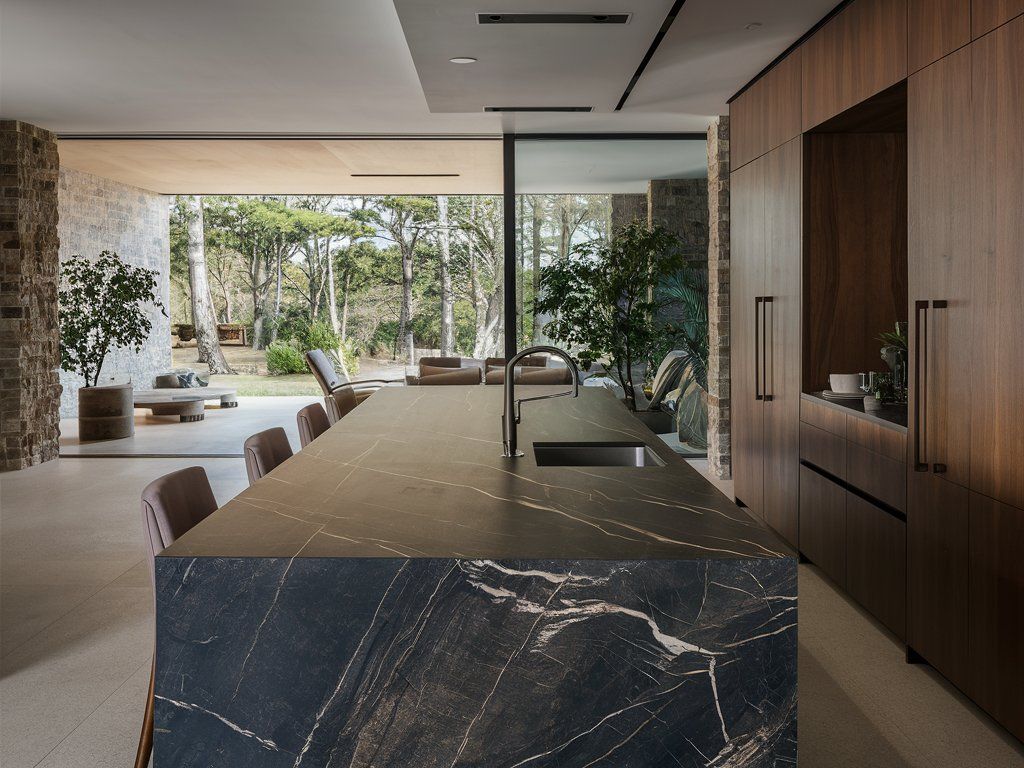 - Dekton “Kelya”: Black marble texture, proof against put on and tear.