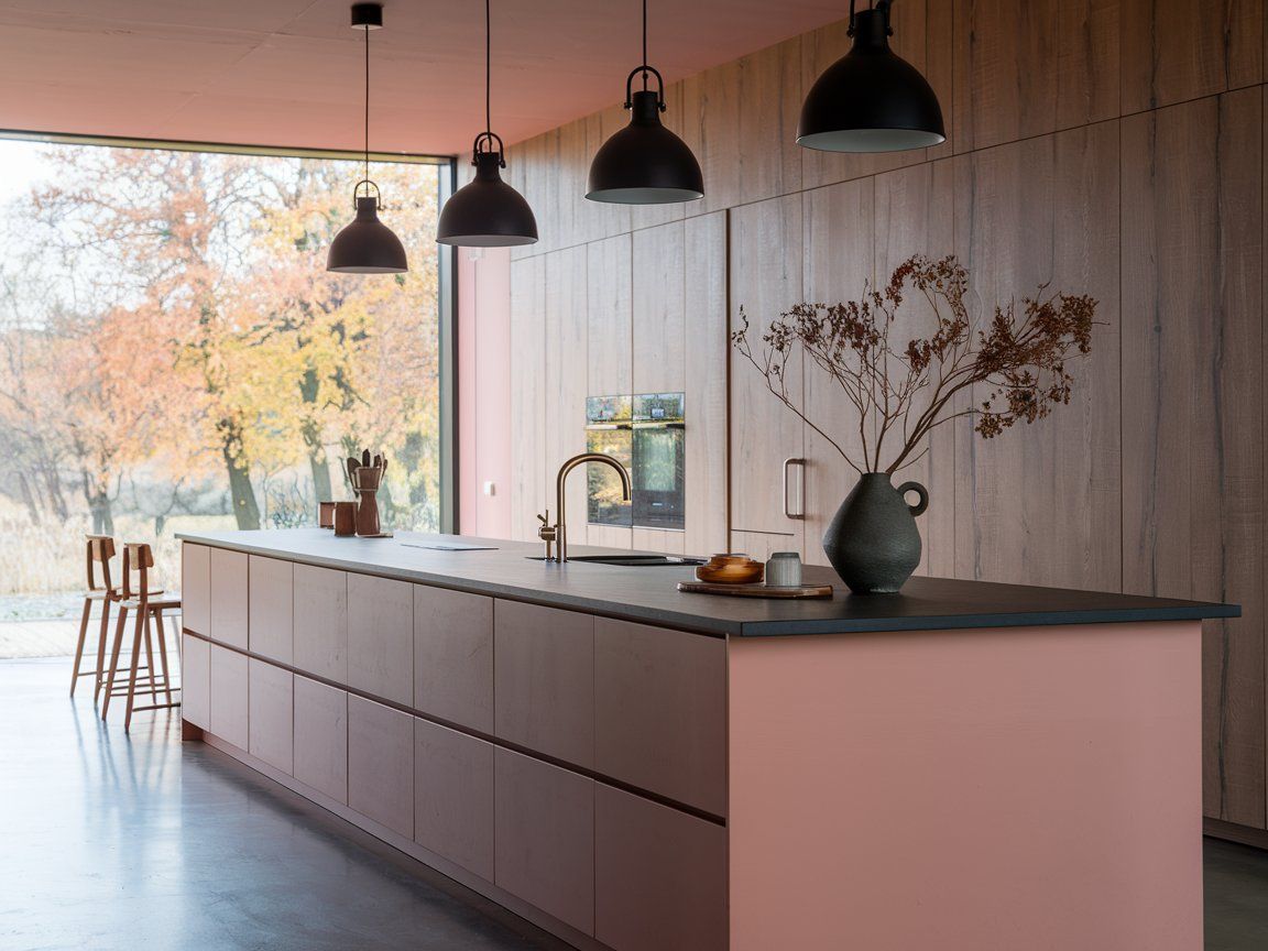 Mix pastel pink cupboards with pure wooden for a kitchen that exudes heat and trendy class. A darkish countertop provides distinction, whereas industrial-style lighting highlights the up to date design.