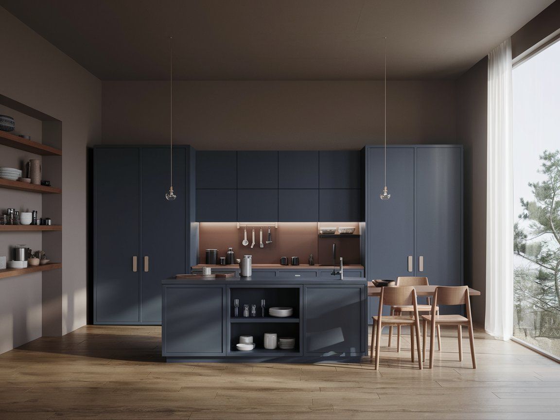 Go for deep blue cupboards in your kitchen, pairing them with heat wood accents equivalent to chairs and flooring. Add refined lighting to spotlight the clear traces and trendy aesthetic of the house.