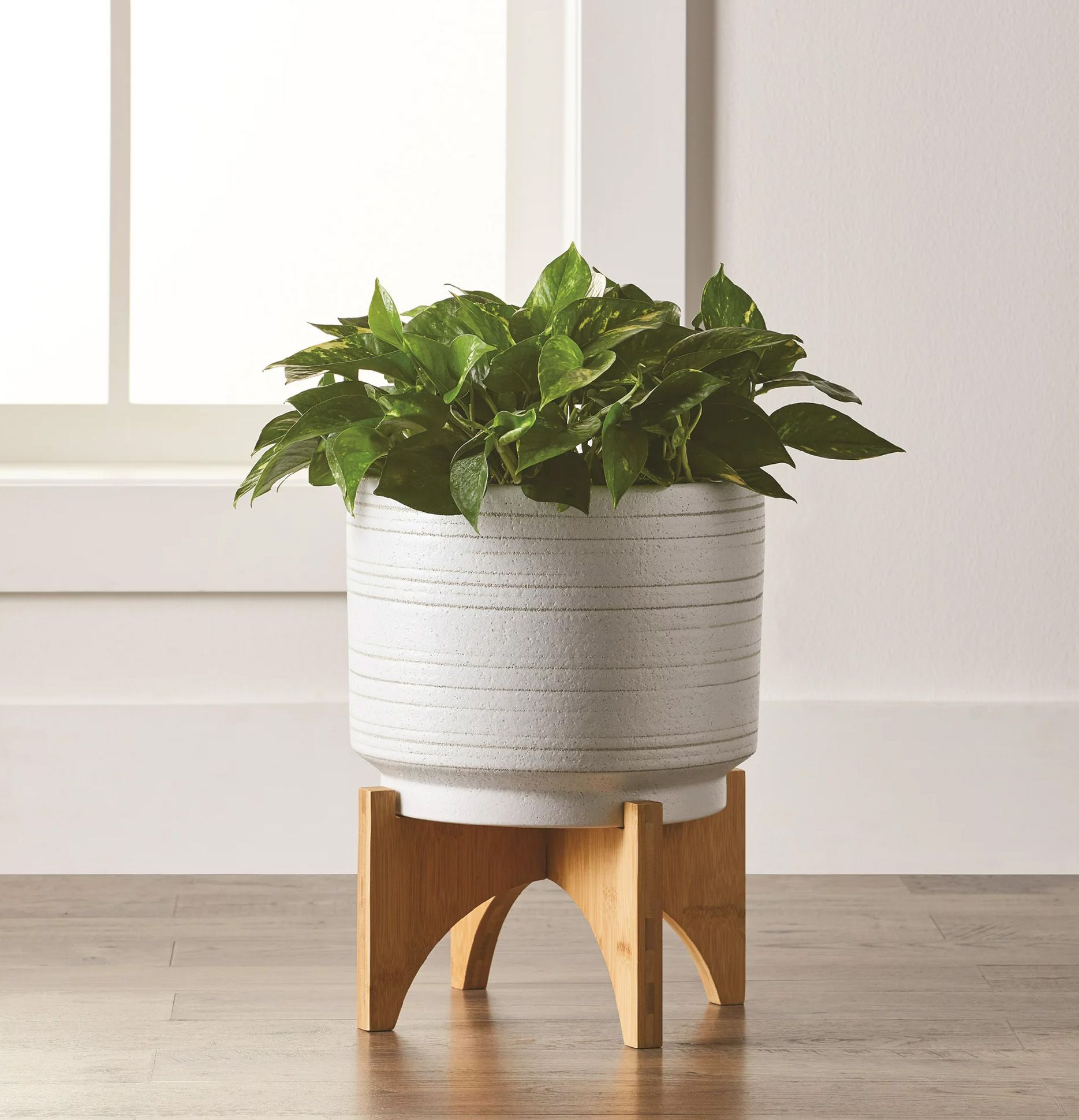 “I am extra of an indoor plant form of gal, however I really like that this ceramic pot can be utilized for each houseplants indoors and seasonal blooms on my outside patio. The wooden stand makes it simple to model with my present residence decor, and the refined texture of the pot makes it versatile sufficient for any room.”