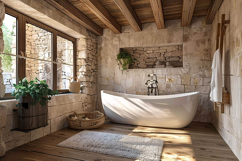 - Traits: Rustic loos exude heat and character, drawing inspiration from the pure great thing about uncooked supplies and natural textures. Uncovered picket beams, stone accents, and reclaimed fixtures create a comfy and alluring ambiance that’s harking back to a countryside retreat.