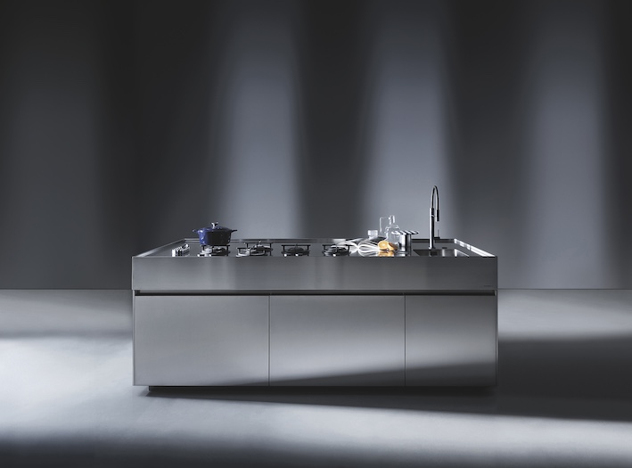 Designed by Roberto Gobbo for Euromobil, the island is made completely of brushed chrome steel, a fabric that mixes solidity and refined aesthetics.