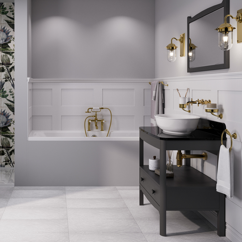 The designs of the Arts and Crafts motion are one other type that may simply be introduced into the trendy period. Our Guild Assortment is impressed by the Arts and Crafts motion of the late nineteenth century. Bringing the ability again to the ornamental arts, the Arts and Crafts motion positioned significance on stunning, well-made objects that may very well be utilized in on a regular basis life. Rejecting extreme ornamentation, this period positioned an emphasis on high-quality items that had been constructed to final. To mix this type with a contemporary lavatory, we’ve used the Guild furnishings unit and mirror in a shocking darkish gray. The minimalist look of those items makes them excellent for mixing with fashionable types. To deliver these conventional items into a recent house, fashionable wall panelling and daring patterned tiles have been used, one other frequent characteristic of up to date inside design. The matching Gold end all through the entire lavatory offers a nod to the previous whereas remaining on development with fashionable color palettes. |