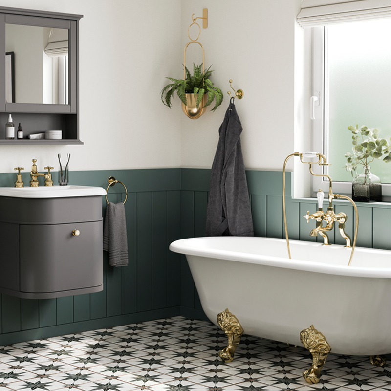 An effective way to mix fashionable and conventional inside types is thru color. Conventional design means that you can be daring and vibrant, whereas modern design is popping away from impartial palettes and leaning extra in the direction of assertion colors. This creates the proper bridge from one type to a different. Take the inexperienced used right here for instance. Inexperienced pops up quite a bit in fashionable design due to its connotations with nature and the skin world, however it’s also synonymous with conventional design types. When mixed with the trendy wall panelling development, this characteristic ties the 2 types collectively. To deliver via the essence of Edwardian design, we’ve used an opulent freestanding tub with delicately designed tub ft and a conventional tub mixer faucet. This assertion piece screams historic design. Lastly, we’ve used a Chalfont furnishings unit and a mirrored cupboard to finish the design. These items characteristic a contemporary reinterpretation of conventional design, completed in a extra modern darkish gray color. |