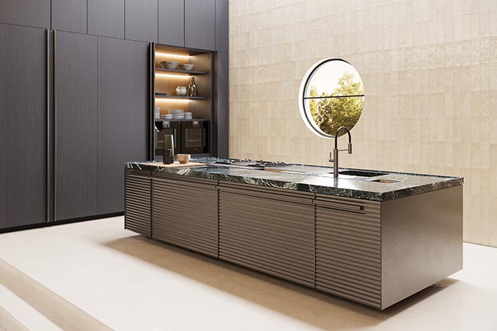 Along with modularity recalibrated for modern calls for and adaptableness to present applied sciences, the kitchen offered on the Milan Design Week “Tribute to Cinqueterre by Vico Magistretti” introduces a special materials dimension: alongside the enduring anodized aluminum end, is now launched a pure stone, significantly Portoro, a valuable number of black limestone from the western space of the Gulf of La Spezia, in tribute to the model’s origins.